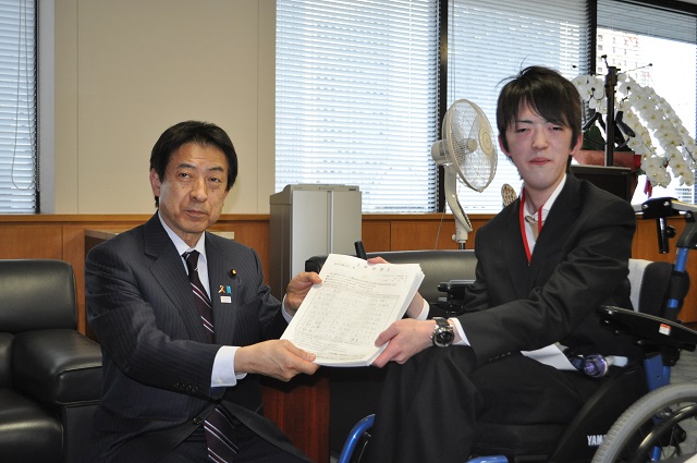 本日は、北九州市で活動をされる「先天性ミオパチーの会」代表の伊藤 亮さん、お母様で代表代行の伊藤 はつ江様とともに、塩崎 恭久 厚生労働大臣へ要望に伺いました。