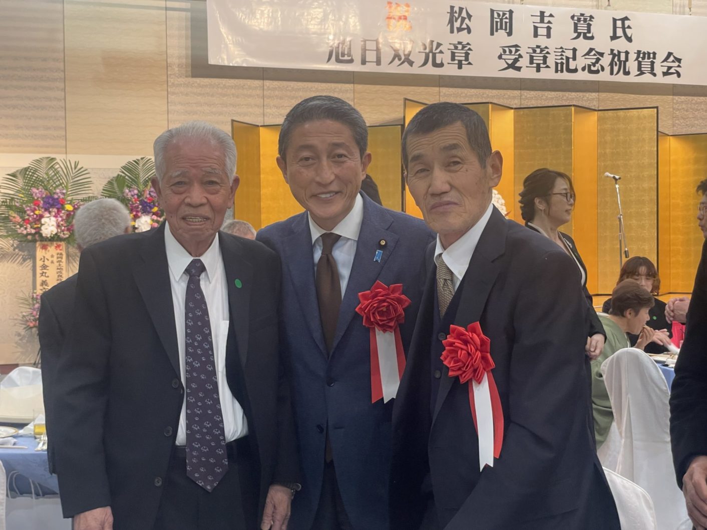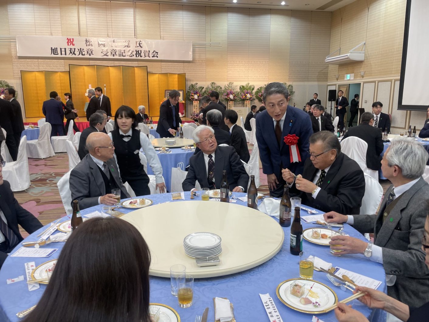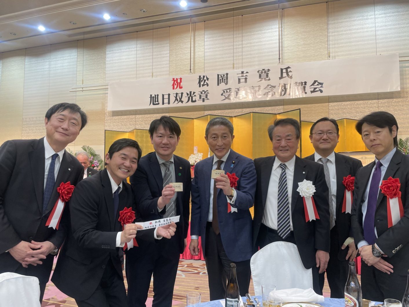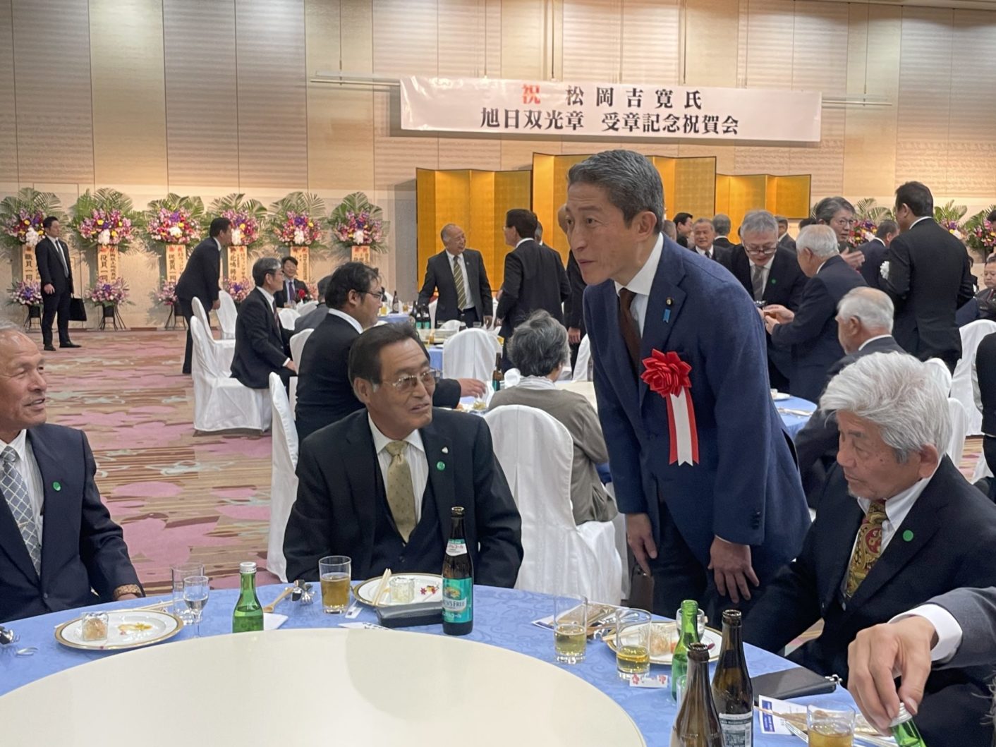 両筑土地改良区理事長 松岡 吉寛 様が、長年にわたり地域農業の発展と土地改良事業の推進に尽力された功績が高く評価され、令和七年秋の叙勲において旭日双光章をご受章され、祝賀会に参加いたしました。
