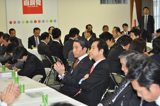 谷垣 禎一 幹事長、甘利 明 経済再生担当大臣からご挨拶、ご報告の後、澁谷 和久 内閣審議官から「日米閣僚協議とTPP交渉の状況について」のご説明がありました。