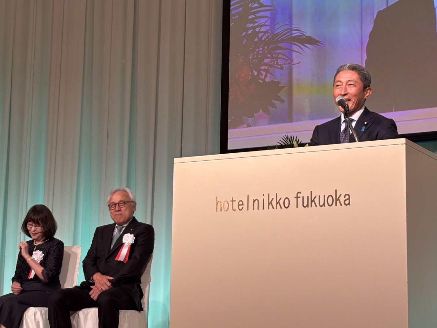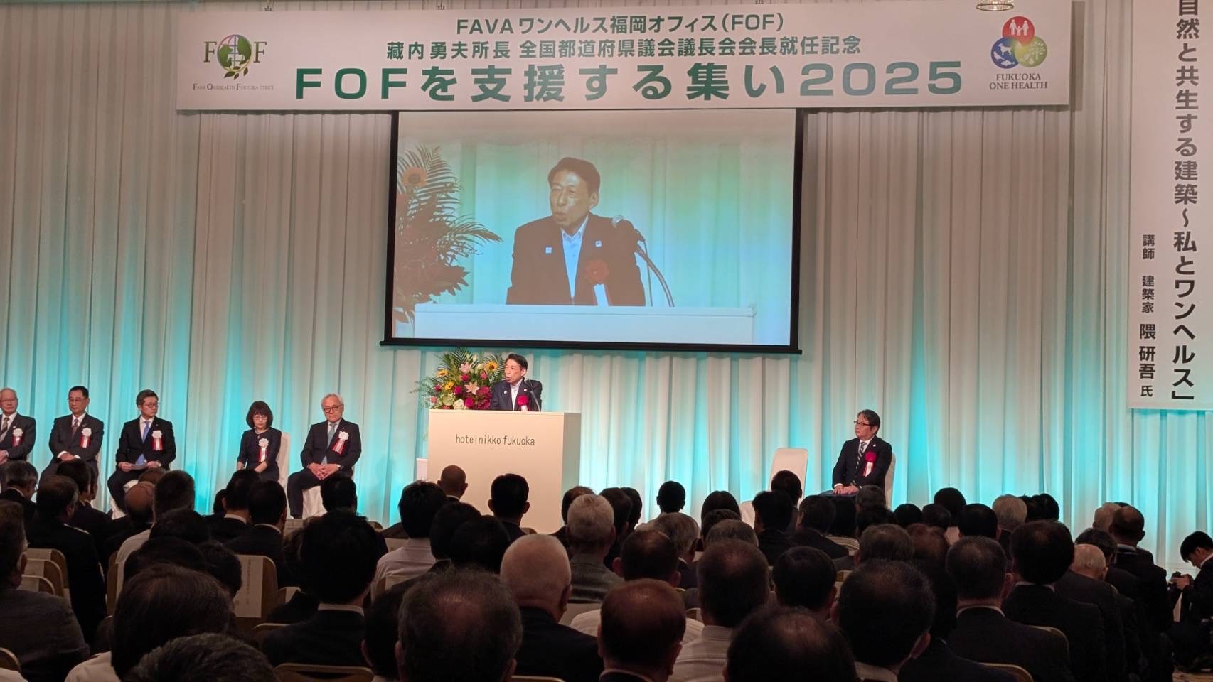 本日は、FAVAワンヘルス福岡オフィス所長を務められ、また世界獣医師会次期会長に就任される藏内勇夫先生の、全国都道府県議会議長会会長並びに福岡県議会議長ご就任を記念するFOFを支援する集いが盛大に開催され、私も出席いたしました。