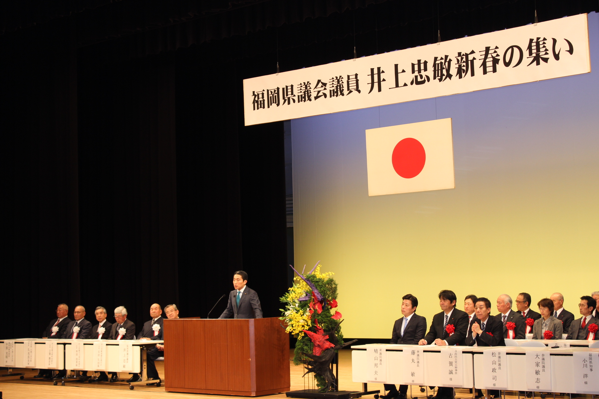 福岡県議会議員の 井上 忠敏 先生「新春の集い」に参加いたしました。 小郡市と大刀洗町の支援者の皆様で会場は一杯でした。 私も皆様にご挨拶させて頂きました。 県議会議員時代の同期でもある井上忠敏先生は、今年4月の統一地方選挙では5期目を目指し、精力的に活動されております。 皆様方の絶大なるご支援・ご支持を井上先生に賜りますことをお願い申し上げます。 ご盛会おめでとうございます。
